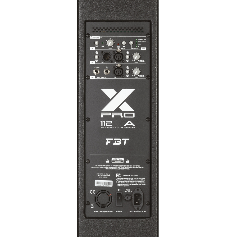 X PRO 112A è un diffusore attivo biamplificato a 2 vie dotato di un woofer da 12” con bobina da 2,5” e un driver a compressione da 1” con bobina da 1,4”, montato su una tromba a direttività costante ruotabile di 80° x 50°. Realizzato in compensato leggero ma resistente con finitura antigraffio, il cabinet può essere utilizzato anche come monitor da palco grazie al suo profilo inclinato di 35°. Alimentato da un amplificatore in Classe D da 1200 W LF + 300 W HF, offre fino a 129 dB SPL con una risposta in frequenza da 50 Hz a 20 kHz. Il pannello di controllo integrato include una sezione di ingresso a tre canali: un ingresso XLR mic/linea, un ingresso stereo di linea selezionabile (jack/XLR) e un canale Bluetooth 5.0 con LED di pairing. Ulteriori caratteristiche includono 4 preset DSP, filtro passa-alto, selettori mic/linea e uscita XLR con selettore CH1 o mix link. Dotato di 4 punti di aggancio M10 e di un attacco per palo standard da 35 mm, l'X-PRO 112A è adatto per l'uso mobile, le installazioni fisse e il monitoraggio sul palco. Tra gli accessori opzionali è inclusa la staffa da parete orizzontale XP-UH 12.