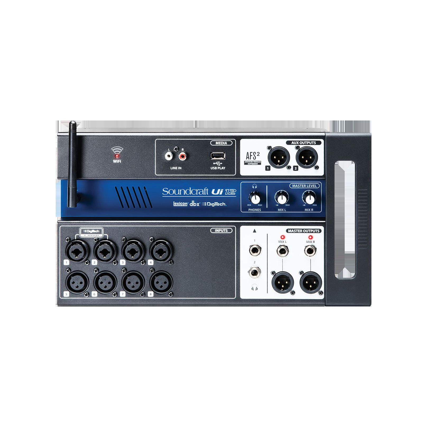 Ui racchiude un sistema di mixaggio digitale completo in un formato stagebox compatto e intelligente, con WiFi integrata e la possibilita' di essere controllato da qualsiasi dispositivo collegato tramite un web browser HTML5. Il modello Ui12 e' equipaggiato con quattro ingressi Mic/Linea combo XLR, quattro ingressi Mic XLR, due ingressi per strumenti Hi-Z e un ingresso di linea stereo RCA. E' inclusa una porta USB a due canali come lettore multimediale, insieme a due uscite Aux bilanciate XLR, due uscite cuffia con controllo di livello su Jack da 6,3 mm commutabili in ulteriori due Aux via software, oltre alle uscite Master bilanciate su XLR e su Jack da 6,3 mm. La porta USB a due canali e' compatibile in lettura con i formati audio MP3, WAV e AIFF. La serie Ui dispone di DSP a bordo dbx, Digitech e Lexicon, inclusi dbx AFS2, Digitech Amp Modeling, e altro ancora. Da entrambi i modelli e' possibile controllare e richiamare da remoto Gain e alimentazione phantom, EQ parametrico a 4 bande, filtro passa-alto, compressore, de-esser e noise gate sui tutti canali di ingresso. Equalizzatore grafico a 31 bande, noise gate e compressore su tutte le uscite, oltre a un analizzatore di frequenza in tempo reale (RTA) su ingressi e uscite. Sono presenti anche tre Bus dedicati agli effetti Lexicon per Riverbero, Delay e Chorus. Inoltre, i controlli del mixer includono tra gli altri: Sub Group, Mute Group e View Group.